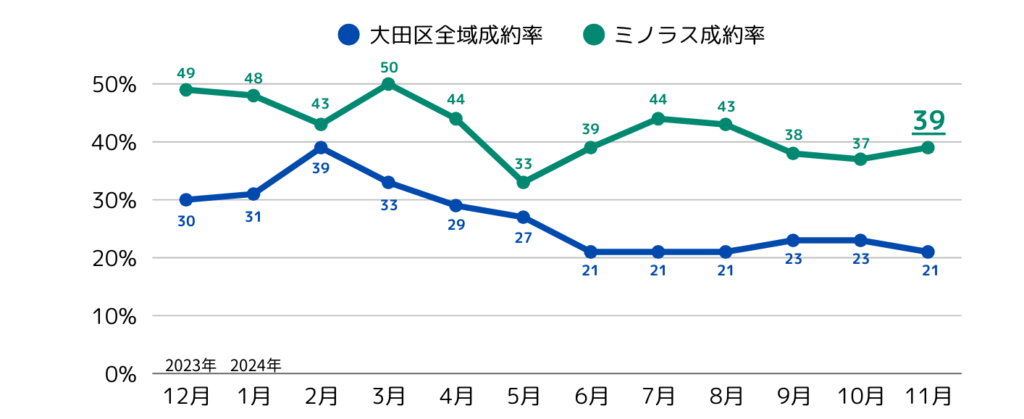 大田区全域のデータによると、2023年11月の募集件数は12,919件、成約数は3,305件で成約率が約26%でした。一方で、2024年11月は募集件数が15,354件、成約数が3,165件で成約率が21%でした。