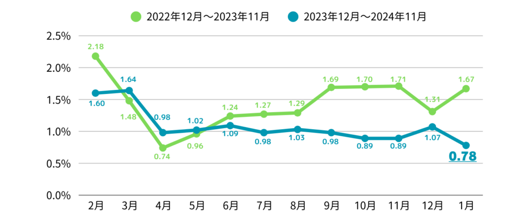 図1のグラフデータより、2024年11月の空室率推移は0.78%と、2024年で最も低い空室率の月となりました。10月は少し解約が増え、空室率が微増しましたが、11月は解約が少ない上にお申し込みも増えたことにより低い空室率となりました。