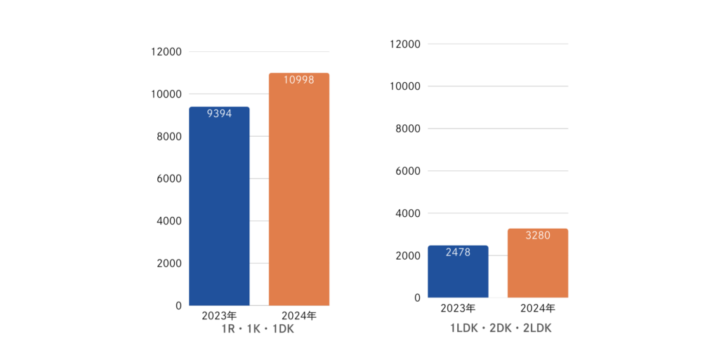 1R・1K・1DKの単身向けの間取りは、2023年11月の9,394件から2024年11月は10,998件で、1,604件増加しており増加率は117%となりました。また、1LDK・2DK・2LDKの間取りに関しては、 2023年11月の2,478件から2024年11月は3,280件で、802件増加しており増加率は132 %となりました。募集件数としては元々単身向けの間取りが多くありましたが、広めの間取りのお部屋も増加傾向にあるようです。