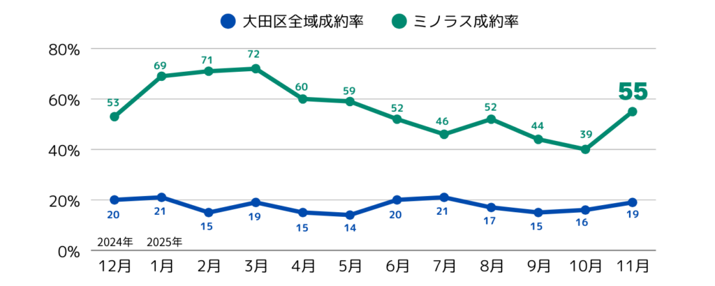 図2の成約率データより、2025年11月のミノラスの成約率は55%(昨年同月39%)、大田区全体の成約率は19%(昨年同月21%)でした。このことから、成約率はミノラス管理物件が昨年対比で上昇しているのに対して、大田区全体においては例年並みで推移していることがわかります。