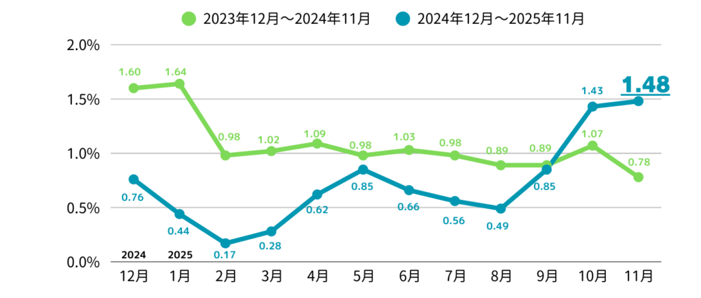 図1のグラフデータより、2025年11月の空室率推移は1.48%となりました。前月より空室率が上昇しており、昨年同月を見るとこの時期は空室率の上昇傾向にあります。