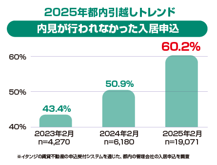 2025年繁忙期で最も象徴的な変化は、従来の内見プロセスを経ない入居申込の急激な拡大です。不動産のDXサービスを提供しているイタンジ(東京都港区)の調査によると、都内の賃貸取引において、実際に物件を見学せずに契約に至るケースは、2023年から2025年の2年間で43.4%から60.2%へと約1.4倍に急増しました。