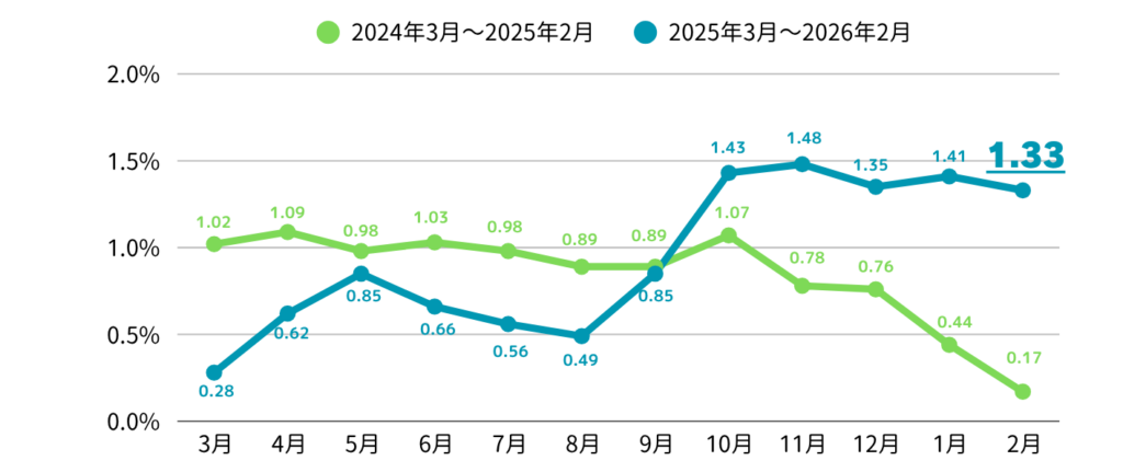 図1のグラフデータより、2026年2月の空室率推移は1.33%となりました。前月より空室率が下がりましたが、数値としては例年並みで大きな空室率の変動はありませんでした。