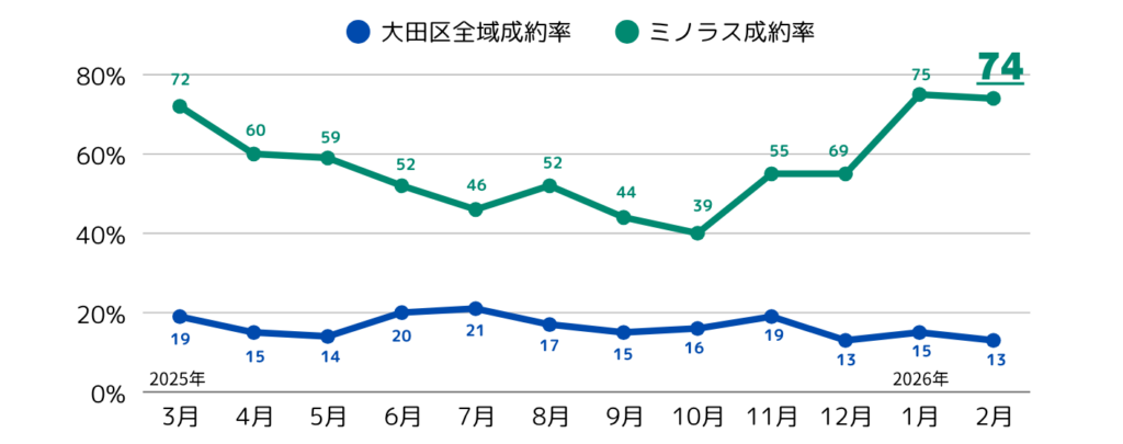 図2の成約率データより、2026年2月のミノラスの成約率は74%(昨年同月71%)、大田区全体の成約率は13%(昨年同月15%)でした。このことから、成約率はミノラス管理物件、大田区全体ともに例年並みで推移していることがわかります。