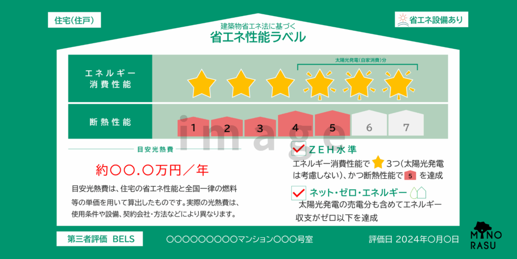 2024年4月からは、住宅の販売・賃貸を行う事業者を対象に「省エネ性能表示制度」が施行されました。この制度では、エネルギー消費性能、断熱性能、目安光熱費、第三者評価、ZEH水準などをラベル表示することが“努力義務”とされています。図1は省エネ性能ラベルのイメージ図です。※実際の省エネ性能ラベルとは異なります。