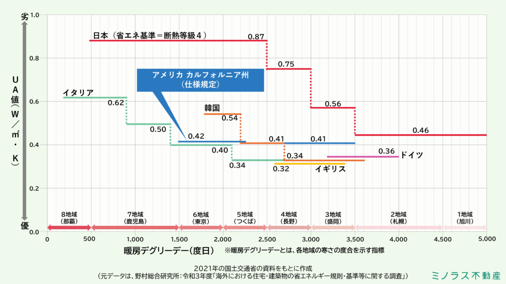下のグラフの縦軸「UA値」は、外壁・窓・床・屋根などから熱がどれほど逃げやすいかを示す指標で、値が小さいほど断熱性能が高いことを意味します。