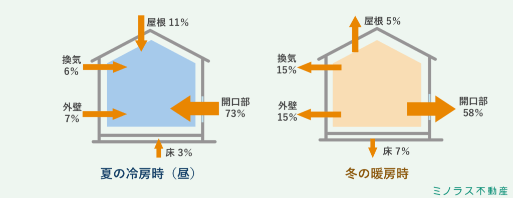 夏は、外壁や床からの熱侵入が7%・3%であるのに対して、窓などの開口部からは73%もの熱が入り込みます。冬も同様で、屋根からの熱逃げが5%である一方、窓からは58%もの熱が流出します。