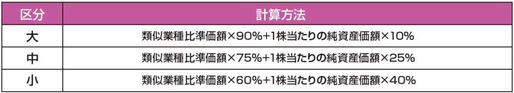 業種の区分は、総務省の「日本標準産業分類」から該当する業種を探し、国税庁の発表している対比表※に当てはめて計算上の業種を決めます。さらに、会社の規模に応じて、自社株の株価を調整する係数である斟酌率(しんしゃくりつ)が異なります。斟酌率の分類は大会社・中会社・小会社の3段階であり、当てはまった分類とそのひとつ上の区分(例:小分類に該当すれば、その小分類が属する中分類)が対象となります。