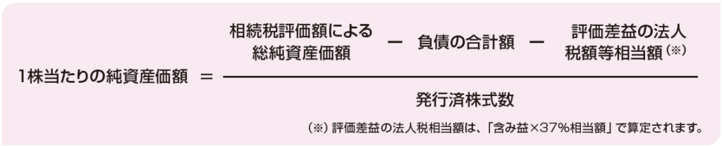 貸借対照表をもとに、純資産の1株当たりの株価を計算する方法です。「今すぐ解散したら、1株あたりいくらになるか」と考えていただくとよいでしょう。ただし、帳簿価額での純資産ではなく、「財産基本通達」に基づいて、会社が解散した場合の価値を想定して資産・負債を時価で評価し、その純資産で算出します。