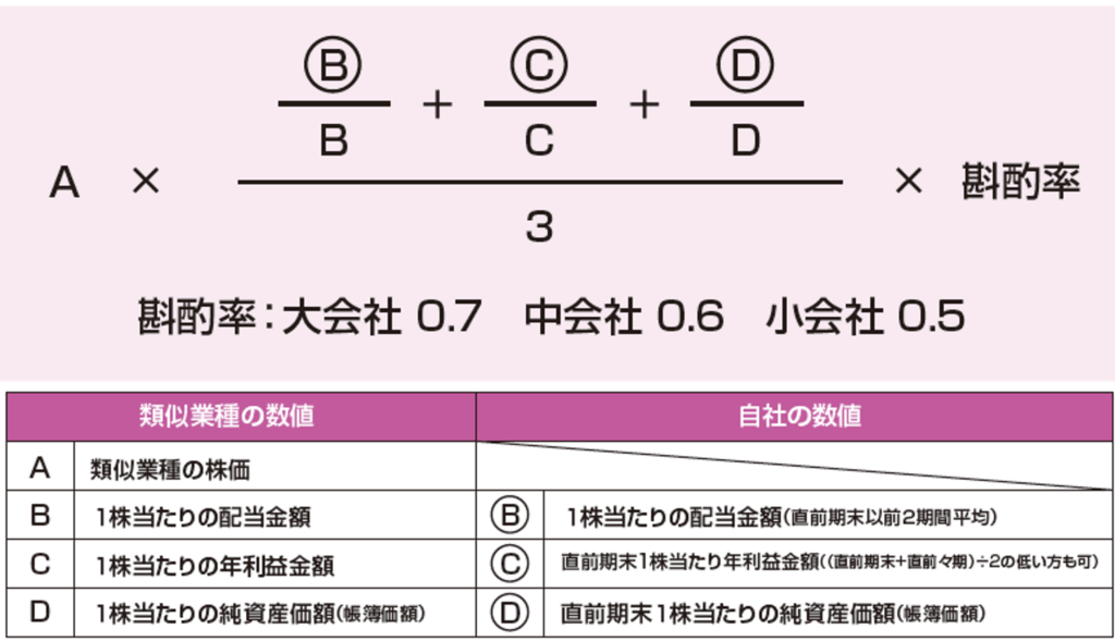 類似業種の上場株価を基準に、自社株式の株価を算出する方法です。国税庁が毎年公表している上場企業の株価を指標とし、配当・利益・純資産の3要素を比較して自社株式の株価を算出します。