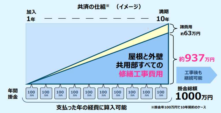 修繕共済と火災修繕共済を組み合わせた共済金制度です。毎月(または毎年)設定した金額を共済に積み立てていきます。
