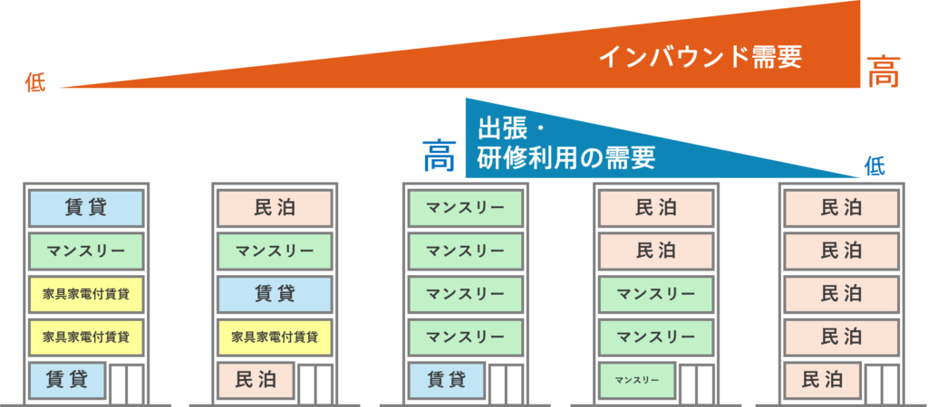 イノベーションサブリースの大きな特長のひとつが、1棟の中でも住戸ごとに貸し方を変更できる点です。例えば、観光需要が高まる時期にはマンスリーや民泊として運用し、市況が落ち着けば通常賃貸や家具付き賃貸へ切り替えるといった対応が可能です。
