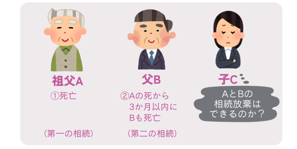 具体例としては、まず祖父Aが亡くなり、相続による遺産を承継するか、放棄をするかを検討中3か月たたないうちに、Aの子である父Bが亡くなってしまった、というケースで、Bの子Cに起きたBの相続は「再転相続」ということになります。