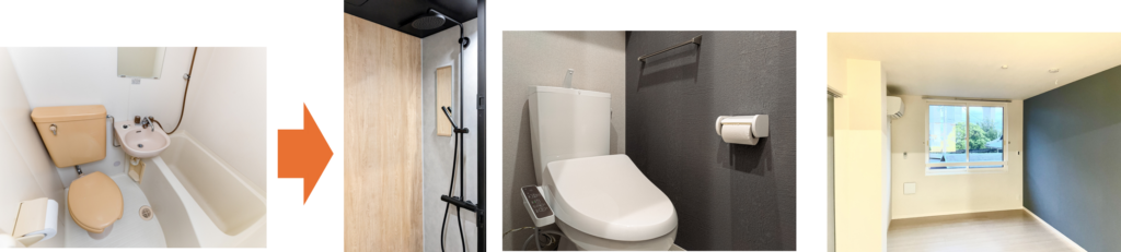 例えば、若い男性のご入居者様が多い物件で、工事前は3点ユニットバスが設置されている場合、浴槽を設けずシャワールームとトイレを分けるといった選択肢も考えられます。