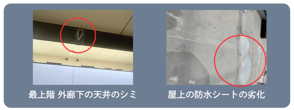 当時、物件は築25年を迎えており、15年前には屋上の防水工事を実施していました。オーナー様から、「最上階、外廊下の天井部分にシミがある。もし、屋上防水が劣化しているようなら、トラブルが起きる前にメンテナンスをしたい。」とご相談を受け、現地確認に向かいました。