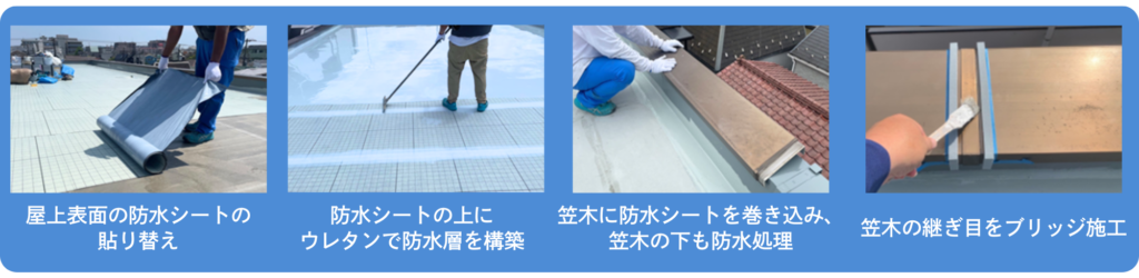 前回の工事で貼り替えた防水層を維持し、その上にウレタン圧着工法を用いて新たな防水層を形成する。また、シート端部を抑える金属製の笠木周辺について、シールの打ち替えとブリッジ工法を用いて防水する。
