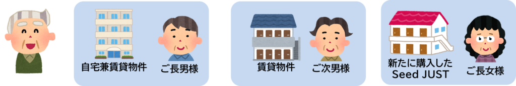 C様は分割対策として、Seed JUSTを借入れで購入し、自宅併用賃貸物件を長男に、賃貸物件を次男に、長女には新たに購入した中古の賃貸物件を渡すことで、それぞれが収益物件を持つことができるようにして公平性を保ち、かつ共有名義を避けることができたのです。