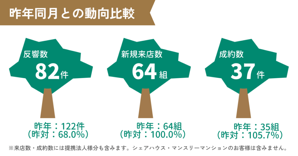 今月は、反響数が昨年よりも大幅に減少しました。募集物件数の減少に加え、解約後に募集を開始しても短期間で申し込みが入ったケースが多く、掲載終了が早まったことが要因と考えられます。一方、新規来店数は前年同数、申込数は前年を上回っていることから、需要自体は堅調であるといえます。