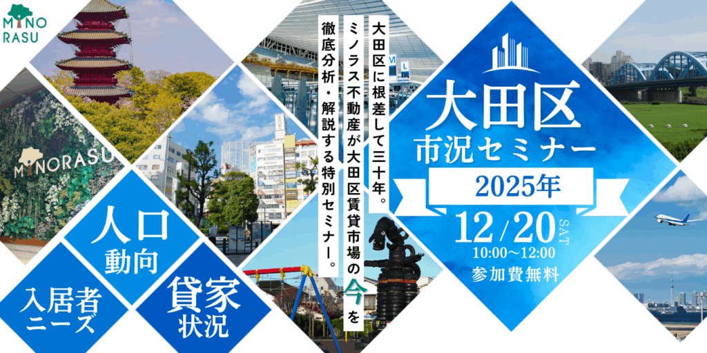大田区で賃貸経営を長期的に成功させていくためには、大田区の地域性をしっかりと理解することがとても大切です。大田区に密着して30年のミノラス不動産がこれまで蓄積してきた経験とデータの双方向から大田区賃貸市場について分かりやすくお伝えします。